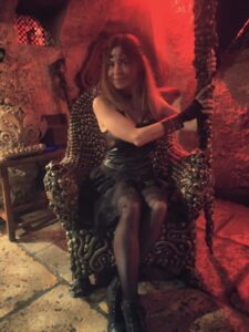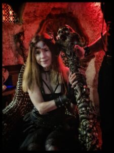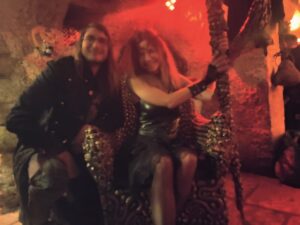En particulier ce trône d’argent, sur lequel nous sommes invités à nous assoir le temps de prendre des photos, munis du sceptre assorti. Pendant un instant, je suis devenue la reine des ténèbres, en compagnie de mon âme damnée ! – une souveraine dark est toujours flanquée de son conseiller dévoyé lui murmurant de sombres desseins à l’oreille.