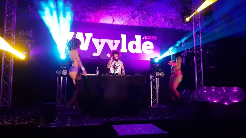 10054-1    Nous sommes accueillis tels des stars sur la croisette : tapis rouge avec les flash des photographes qui crépitent, coupe de champagne offerte dans la foulée… Nous sommes plongés dans la fête d’emblée, et ouvrons grand les yeux en découvrant les lieux. On nous a téléportés dans un autre monde, une véritable oasis, avec ses palmiers, sa plage et ses transats, ses coussins gonflables estampillés Wyylde, son cours d’eau qui serpente le long d’un mur… Peut-être qu’on finira tous dans l’eau en fin de soirée et qu’on s’aspergera à qui mieux mieux ?
