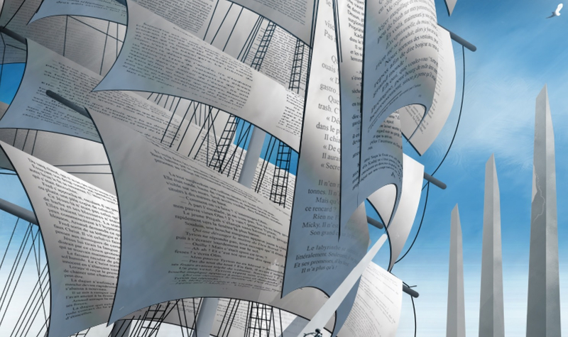 Vael Cat a dessiné une superbe couverture : un bateau dont les voiles sont composées de pages qui s’envolent dans le vent. — Chaque voile reprend des extraits de nos nouvelles !