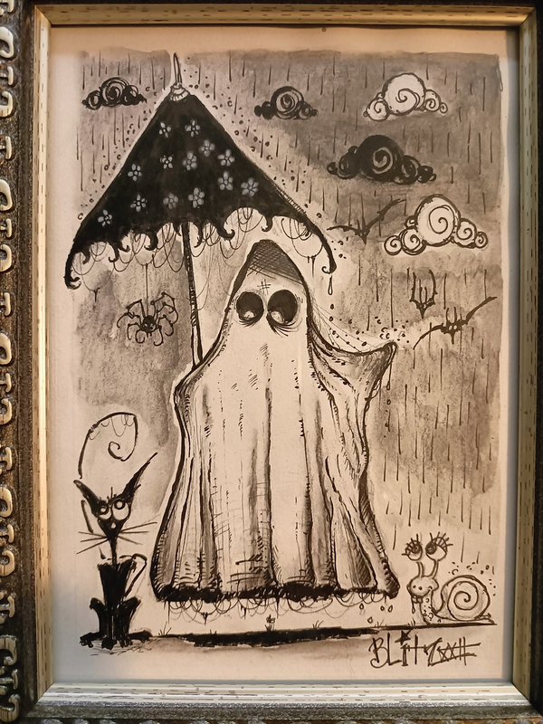 Le fantôme commandait aux portes, aux fenêtres, aux boiseries…  à tout ce qui meublait son château. Il ouvrit la porte et s’envola à l’extérieur, poussant des hou hou de victoire. Des nuages noirs s’amoncelaient à l’horizon, la pluie tombait à verse. Fichu météo écossaise ! Il risqua un bout de drap hors du parapluie, histoire de vérifier si ça se calmait – que nenni ! Et pour tester la sensation aussi, curieux. Il sentit son drap se mouiller, coller. Il n’avait aucune envie de jouer à Mister fantôme au drap mouillé ! Il ramena vivement son drap à l’abri. Mais soudain, une bourrasque plus forte que les autres retourna son parapluie, il fut instantanément trempé jusqu’aux os ! Ah non, tiens, il n’avait pas d’os… Le fantôme avait oublié ce qui se cachait sous son linceul, depuis le temps. En fait, rien. Son âme se glaça. Pour en avoir le cœur net, il se débarrassa de son drap et s’offrit à la pluie. L’eau dessina les contours de son corps évanescent, l’évocation de ce qu’il fut autrefois : le seigneur de ce château dans toute sa splendeur ! Enfin, le souvenir de sa splendeur… Mais seuls le chat et l’araignée étaient là pour le contempler. L’araignée était d’ailleurs fâchée, elle avait été éjectée sans ménagement, elle s’était rattrapée de justesse aux poils du chat, lequel s’était abrité sous l’auvent de l’entrée. Il se promènerait plus tard, ça tombait dru.