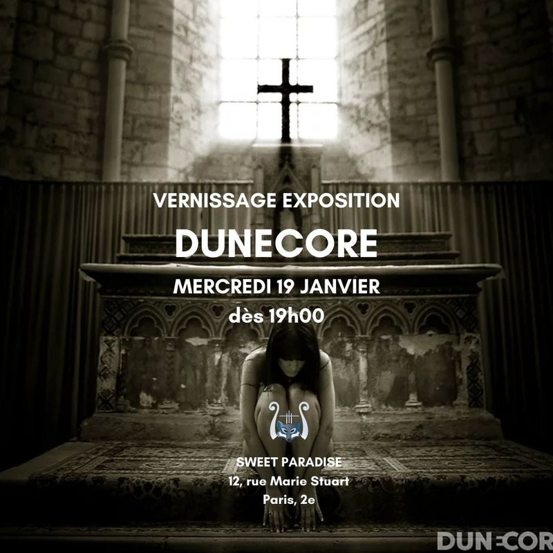 C’est aussi la soirée de vernissage de l’exposition d’un photographe, Dunecore. J’ai beaucoup aimé ses belles photos en noir et blanc, transgressives à souhait : des jeunes femmes nues allongées ou en prière dans des églises. J’aime l’association de l’esthétisme de la religion et de l’érotisme. Les deux contraires qui s’attirent ! Je voulais lui demander si je pouvais en photographier une ou deux, mais je n’ai pas osé au début, et ensuite je n’ai plus eu le temps…