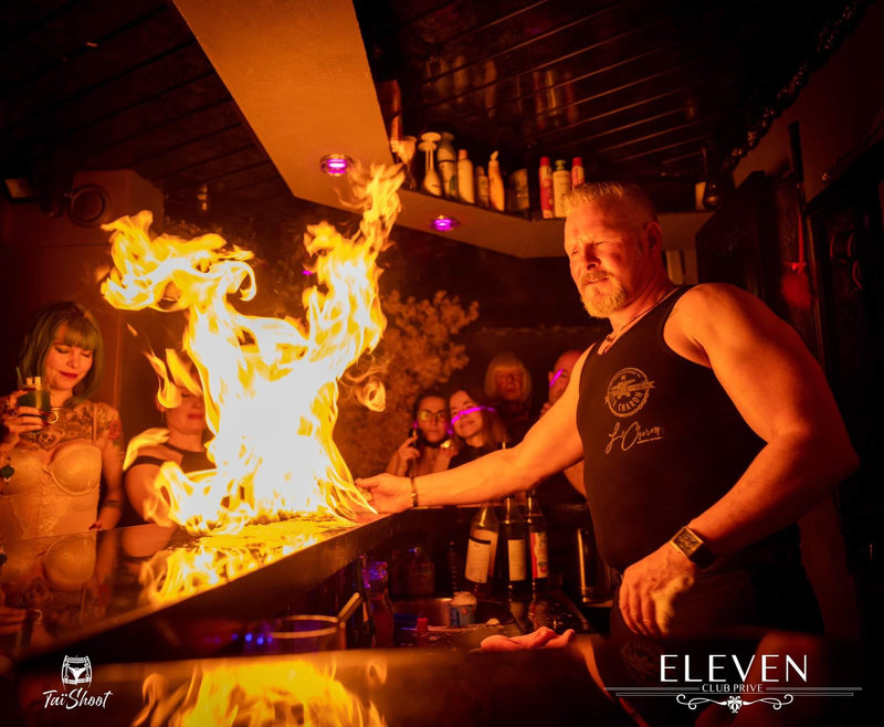 Deux jeunes femmes s’étendent chacune leur tour sur le comptoir. Leur dos s’enflamme comme une torche, c’est très beau ! L’une d’elles me confiera le plaisir ressenti : l’appréhension d’abord, et puis cette boule de feu, une sensation de chaleur intense, qui a provoqué un plaisir incroyable, presque un orgasme… Elle adore les sensations fortes, et compare ces ressentis à ceux qu’elle éprouve sur des montagnes russes : la peur, l’adrénaline, le plaisir libérateur… Fascinant ! Je suis à deux doigts de m’allonger sur le bar à mon tour ^^