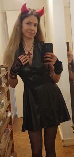 (J’ai essayé de ne pas être reste côté tenue, avec mes cornes de diablesse et ma croix en perles ; mi démone mi sainte-nitouche ^^. Je viens les mains vides sinon, pas de martinets ni de paddle, ils m’encombreraient pour danser. J’ai simplement noué un large ruban de satin autour de ma taille, pour éventuellement attacher des mains, bander des yeux, fabriquer une laisse improvisée… mais je n’y ai plus pensé, le ruban n’a pas quitté ma taille avec son nœud romantique, et personne n’a tiré dessus…)