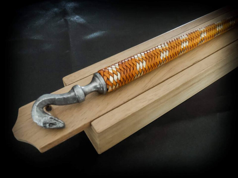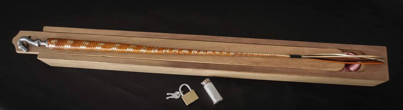 J’arrive in extremis, on me remet le stick entre les mains, j’ose à peine y croire ! Je vis tout à travers une sorte de filtre tant la joie me brouille les sens. Je découvre le magnifique stick en cuir camel et or réalisé par Le Charon, avec sa poignée en forme de serpent. Il est vraiment magnifique et je l’adore sur le champ ! Il repose dans une très belle boite en bois, un long plumier tapissé de satin nacré. Je confie la boite à mon soumis le reste de l’après-midi, je souhaite garder mon stick en main, je ne le quitte plus.