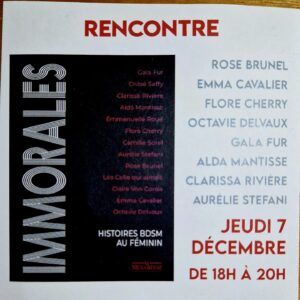 Et le 7 décembre prochain à partir de 18h, rendez-vous à la Musardine pour une petite fête autour du recueil de nouvelles « Immorales » ! Au plaisir de nous revoir !