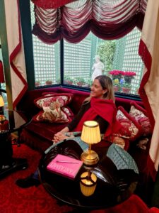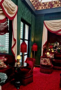 La visite se termine par une halte dans la très belle Maison Souquet. Coup de foude ! Ancienne maison close, devenue un hôtel prestigieux, elle ne renie pas ses origines : sa façade s’orne de magnifiques lanternes rouges qui signalaient une maison close. Ses salons sont décorés dans l’esprit de l’époque : salon oriental, salon bar-bibliothèque feutré, jardin d’hiver cosy… Un lieu magnifique, qui donne envie de s’y attarder en galante compagnie ! Je me promets de revenir y prendre un verre un jour, il ne me reste qu’à trouver la galante compagnie ^^