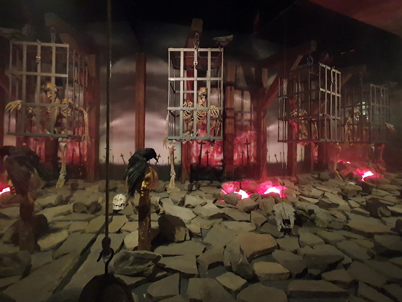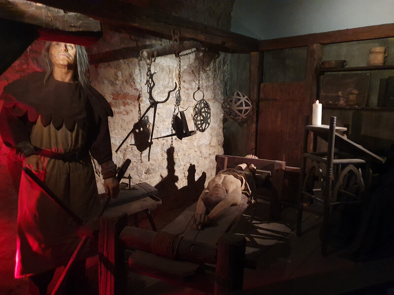La dernière salle, enfin. On propose au visiteur de glisser sa tête dans un pilori pour une photo souvenir, au côté d’un bourreau de cire encapuchonné brandissant sa hache. Sur le mur d’en face, un panneau se veut encourageant « la photo est à récupérer à la sortie ! ». Très peu pour elle, elle préfère filer vers l’escalier sans s’attarder plus longtemps.