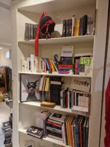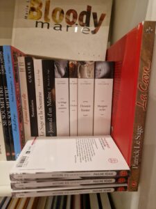 Un bel espace librairie est installé contre un mur, je reconnais des livres des Éditions Musardine, des Éditions Tabou… et je vois mon roman Le Village des soumises en bonne place, cela me fait très plaisir !